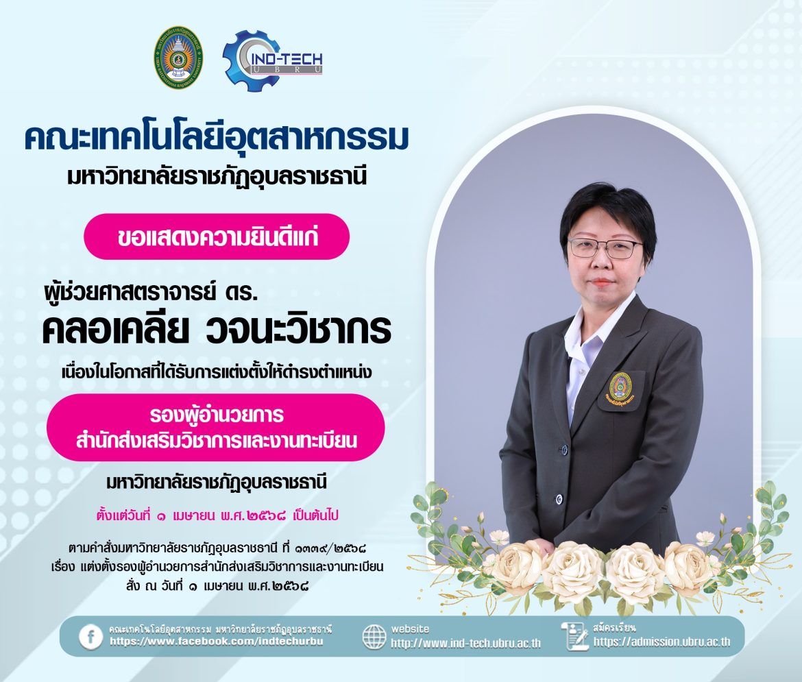 ข่าวอาจารย์ ขอแสดงความยินดีแก่ ผู้ช่วยศาสตราจารย์ ดร.คลอเคลีย วจนะวิชากร by admin 8 เมษายน 2025 written by admin 8 เมษายน 2025 312 0 comment 0 FacebookTwitterPinterestEmail admin previous post สาขาเทคโนโลยีสารสนเทศ คณะเทคโนโลยีอุตสาหกรรม มหาวิทยาลัยราชภัฎอุบลราชธานี เปิดรับสมัครนักศึกษาใหม่ ระดับปริญญาตรี ภาคปกติ ปีการศึกษา 2568 รอบโควต้าพื้นที่ next post สาขาวิชาเทคโนโลยีสารสนเทศ เปิดรับสมัครรอบโครงการ 1 รับตรงโดยคณะ You may also like ขอแสดงคว... 11 กันยายน 2025 ขอแสดงคว... 3 มกราคม 2025 ขอแสดงคว... 3 มกราคม 2025 ขอแสดงคว... 3 มกราคม 2025 ขอแสดงคว... 3 มกราคม 2025 สาขาจัดป... 2 กันยายน 2024 กิจกรรมถ... 18 กรกฎาคม 2024 คณาจารย์... 1 กรกฎาคม 2024 วช. ประก... 10 มิถุนายน 2024 บริการวิ... 6 มิถุนายน 2024 Leave a Comment Cancel Reply Save my name, email, and website in this browser for the next time I comment.